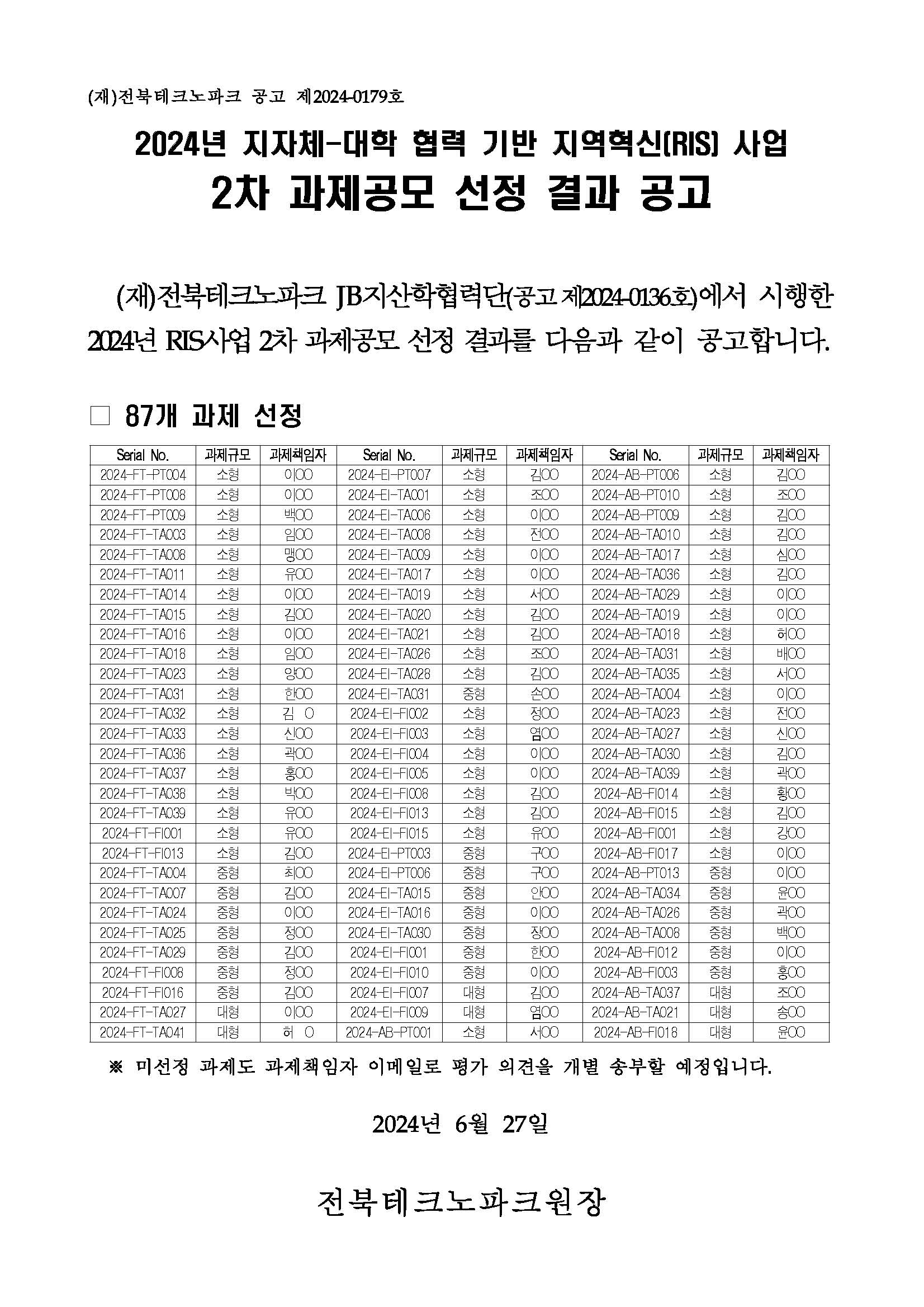 2024년 지자체-대학 협력 기반 지역혁신(RIS)사업 2차 과제공모 최종 선정평가 결과가 전북테크노파크 홈페이지에 공고되었습니다.