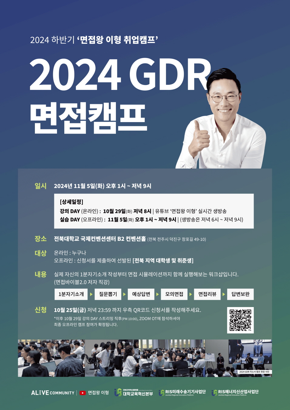 면접왕 이형의「2024 GDR 캠프」안내 작성자관리자 작성일자2024-10-29 10:10:12 조회598 면접왕 이형의 「2024 GDR 캠프」 안내 면접왕 이형의「2024 GDR 캠프」 참여 학생을 모집하오니 학생들의 참여 바랍니다. 1. 교육일시: 2024.11.5.(화) 13:00~21:00 ※10.25.(금) 22:00 줌 OT필참!!2. 교육장소: 전북대학교 국제컨벤션센터 지하2층 컨벤션홀3. 참여대상: 전북지역혁신플랫폼 참여대학 재학생 및 지역청년4. 주요내용: 실제 자신의 1분 자기소개 작성, 면접 시뮬레이션 등5. 접수기간: 2024.10.25.(금) 23:50까지6. 접수방법: 포스터 내 QR코드7. 문의: 063-219-5808 2024.10.29.전북지역혁신플랫폼 농생명·바이오사업단